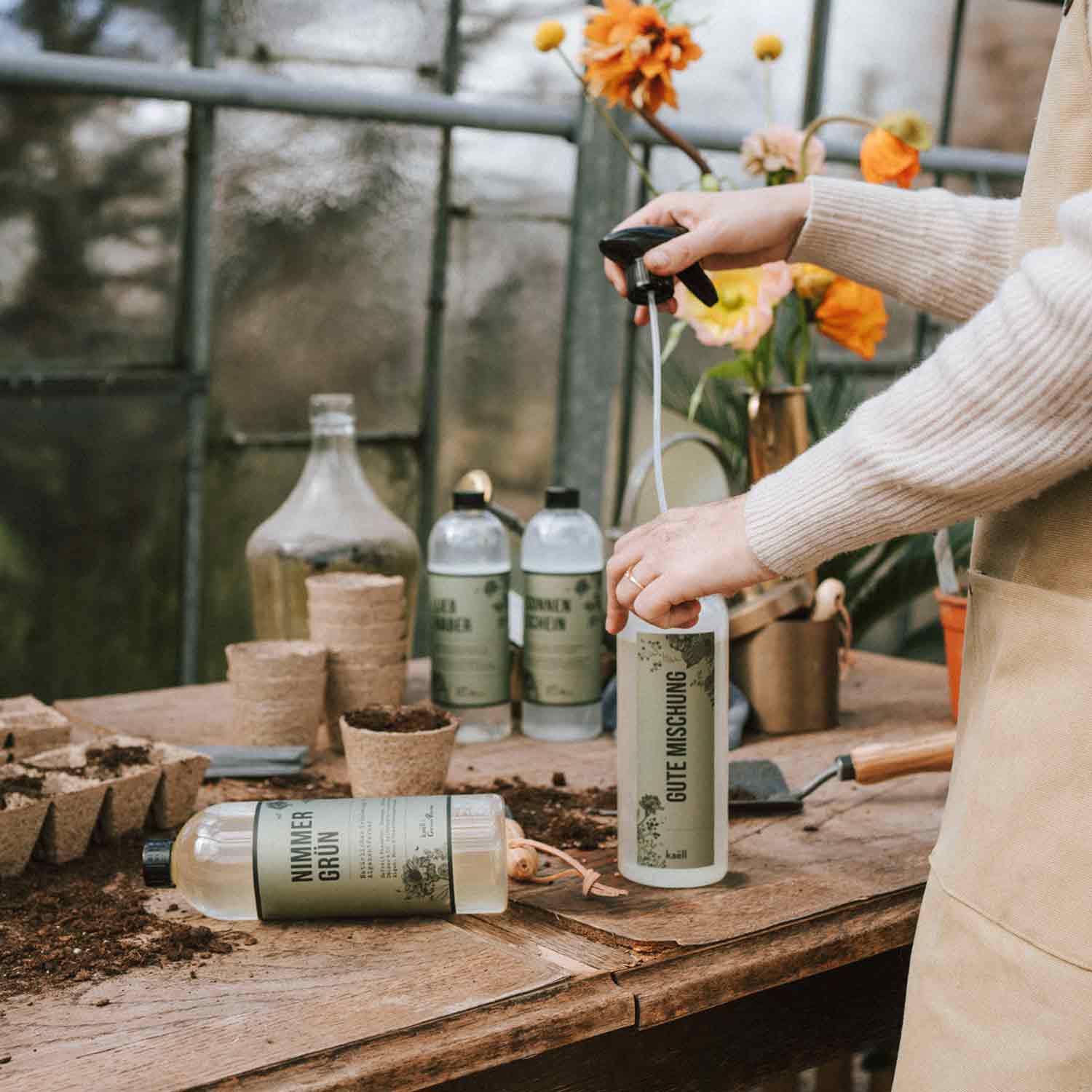 Fülle den Rest der Mischflasche mit Leitungswasser auf und nutze den passenden Sprühkopf.